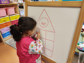 decena, xa que na familia do 10 atopamos os números "tramposos" (11, 12, 13, 14 e 15) polo que todos os días escribimos os números dende o dez ata o vinte, aínda que as veces os facemos en espello (do revés), e ata os estamos aprendendo en inglés. Facemos tamén sumas e traballamos o concepto de anterior e posterior. Esta semana añadimos as restas! Mentres o encargado ou encargada fai a casiña que escolle no panel, un voluntario escríbea na pizarra pequena